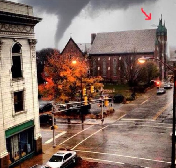 Pretty wild.  A leading TV station, and other outlets, in storm-wracked Indiana posted this photo on its site from viewer--who added the funnel cloud, a UFO and, some way, Big Foot.
